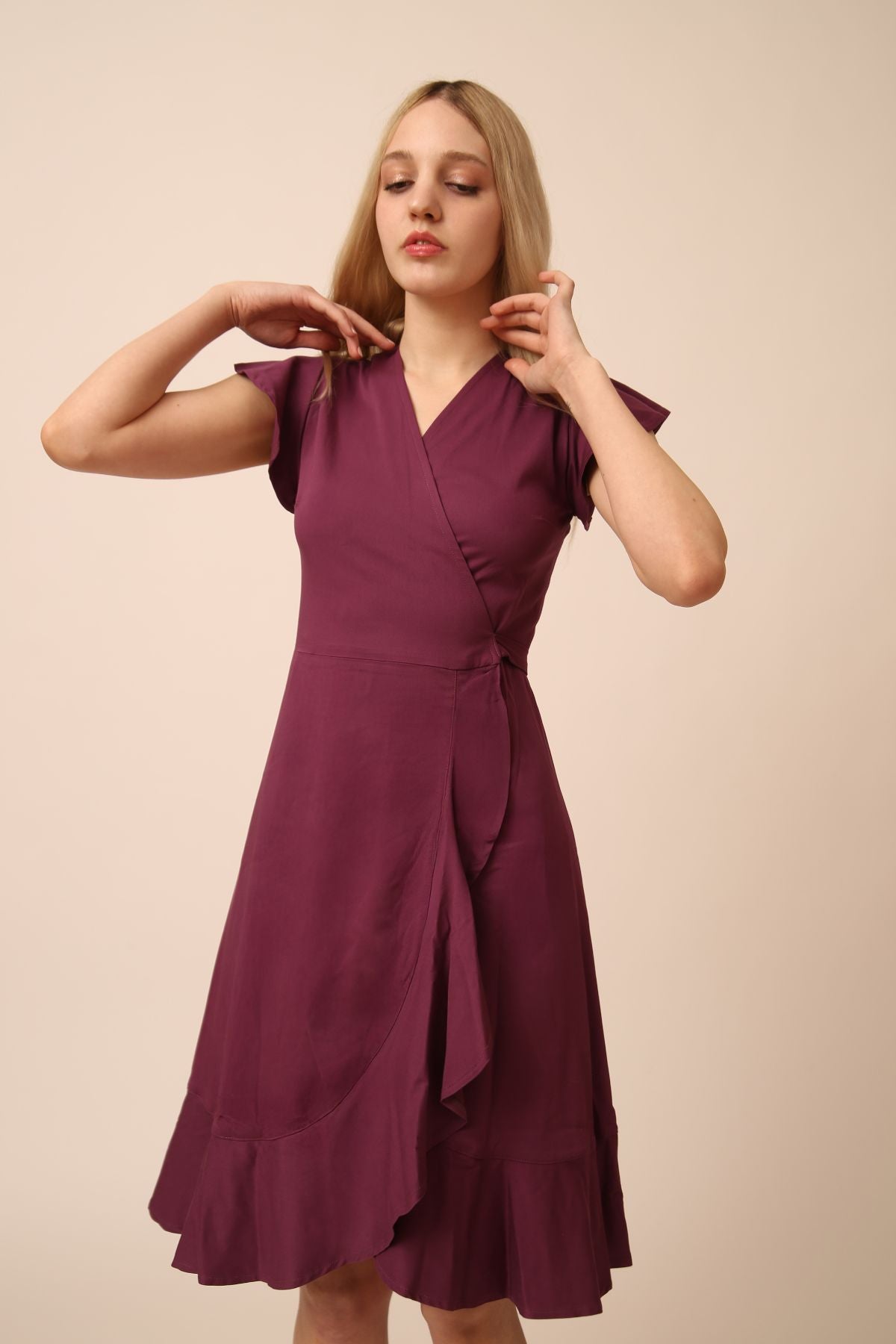 Tyto fialové zavinovací šaty z limitované kolekce jsou ženské, pohodlné a neuvěřitelně lichotivé. Díky promyšlenému střihu s přestřižením v pase krásně zvýrazní siluetu a podtrhnou dekolt. Zavazování v pase umožňuje šaty přizpůsobit přesně podle potřeby a zároveň jemně odvede pozornost od případných nedostatků.