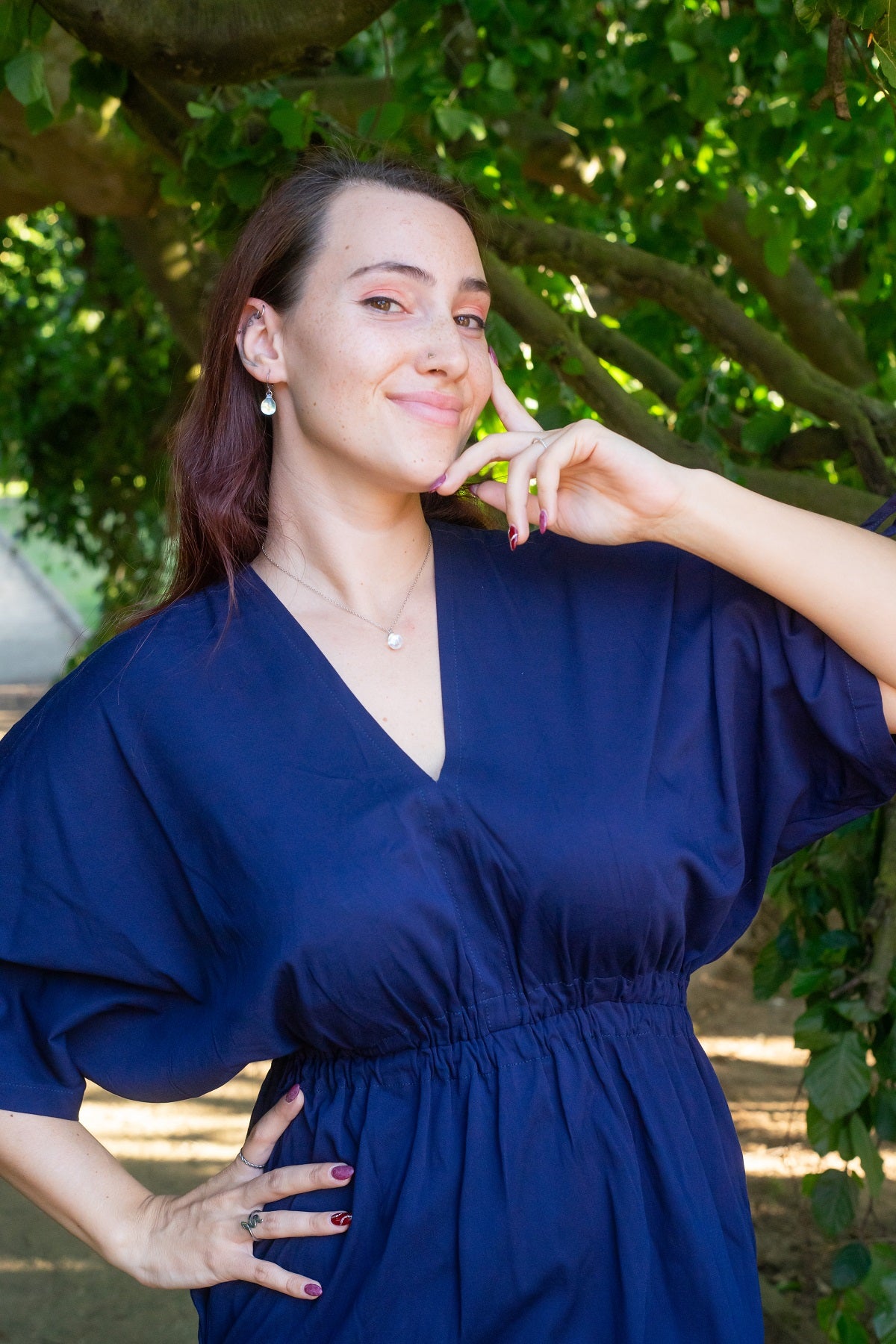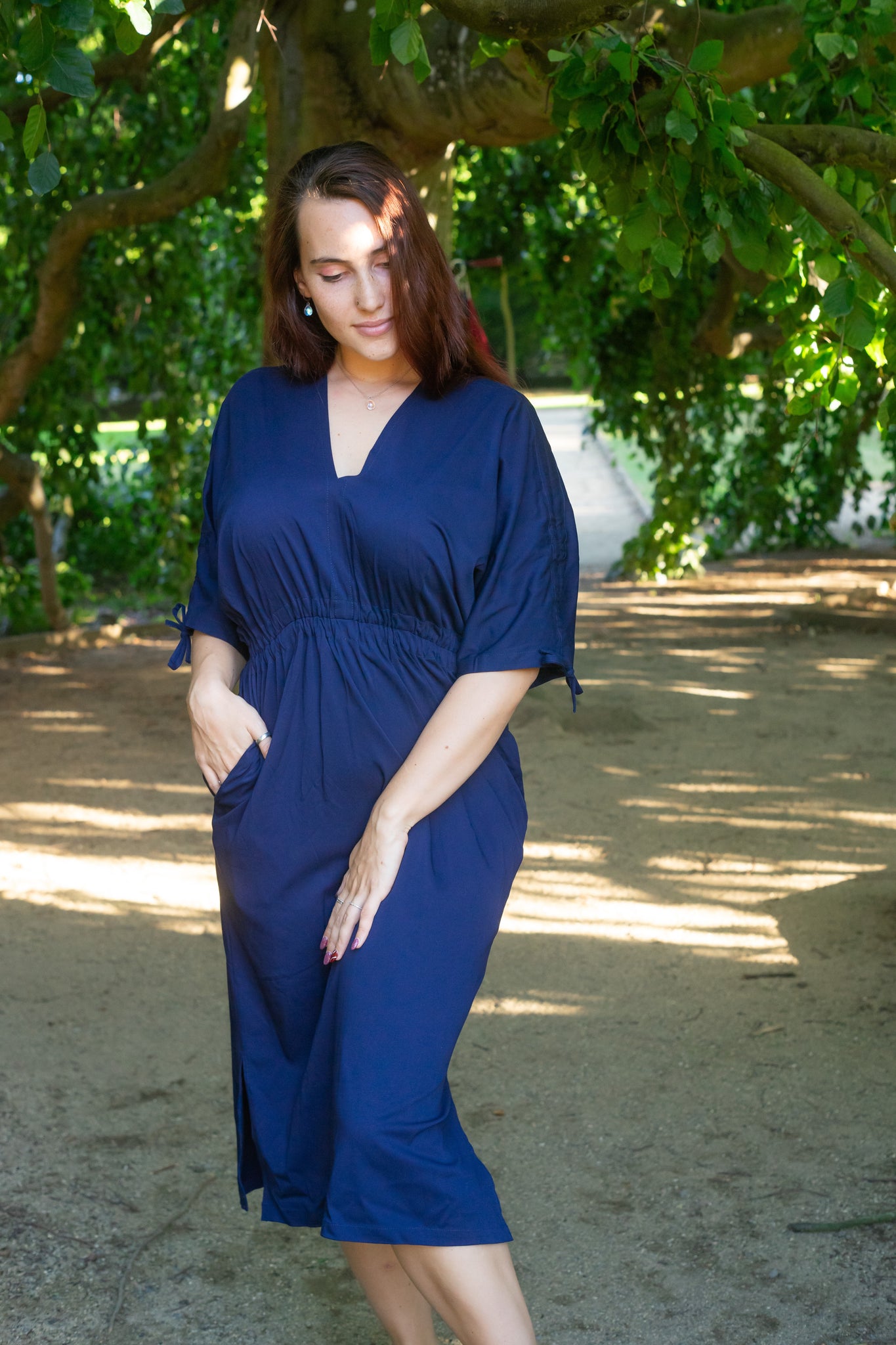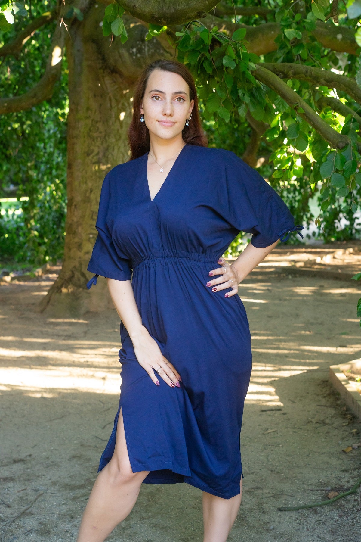 Šaty mají rozparky po stranách, pas na gumu a výstřih do V, který lichotí každé postavě. Díky stahovacím šňůrkám na rukávech si snadno upravíte délku podle nálady. Praktické kapsy ve švu doplňují jejich nadčasový design. Jedna univerzální velikost perfektně padne ženám nosícím S až L.